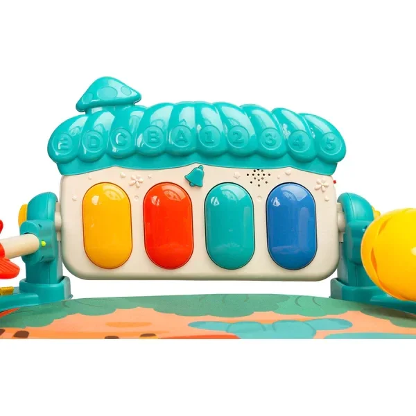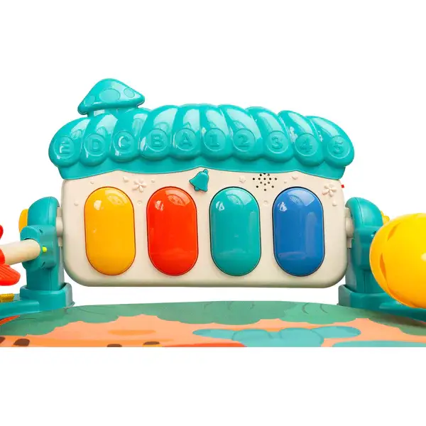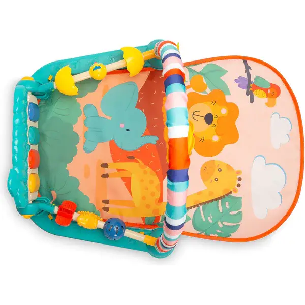 Elementy sensoryczne – zabawki zamontowane po bokach maty wpływają na rozwój zmysłów, koordynacji i zdolności poznawczych.