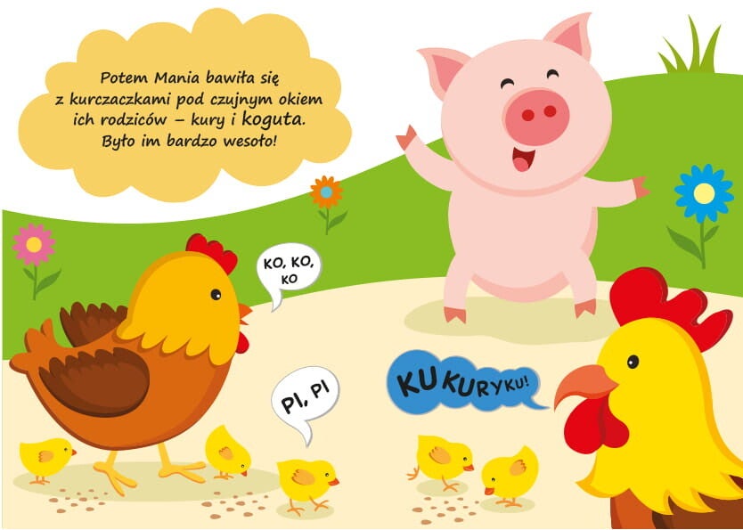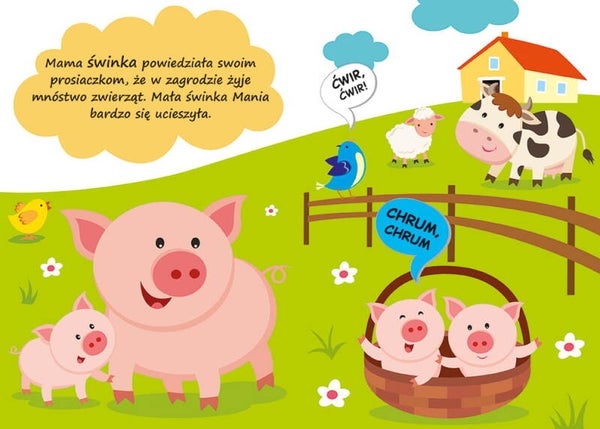Książka zabiera małych czytelników na wieś, gdzie świnka spotyka inne zwierzątka. Zawiera krótkie, proste historyjki oraz mnóstwo wyrazów dźwiękonaśladujących. Po naciśnięciu silikonowych przycisków dźwiękowych dziecko usłyszy 6 różnych dźwięków, poznając odgłosy świni, krowy i konia. Ilustracje są żywe i kolorowe.