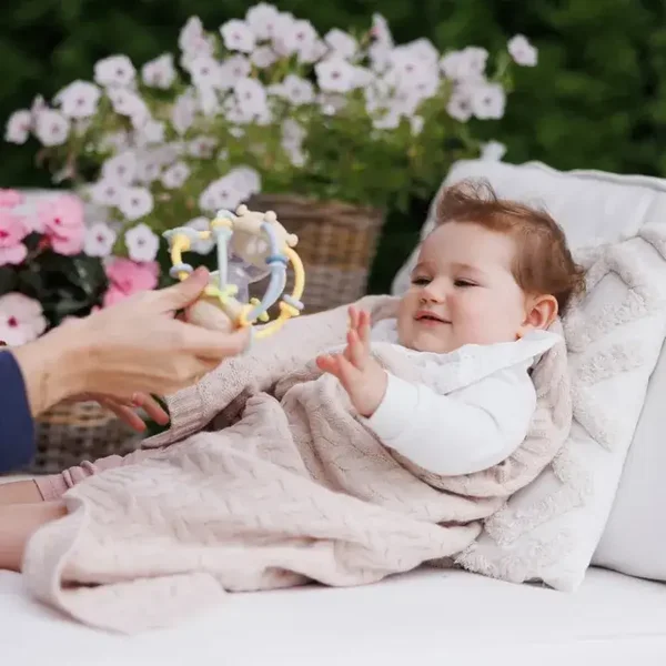 Kolorowy gryzak z miękkimi wypustkami masuje dziąsła, przynosząc ukojenie podczas ząbkowania. Przezroczysta klepsydra z kolorowymi kuleczkami delikatnie grzechocze, przyciąga wzrok i uczy obserwacji. Ruchome elementy na silikonowych pałąkach oraz obrotowe kółko na spodzie zapewniają dodatkową stymulację i radość z zabawy.