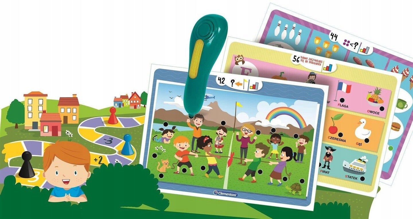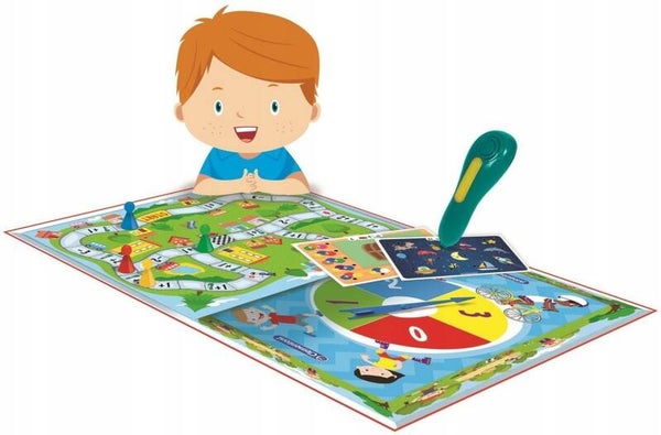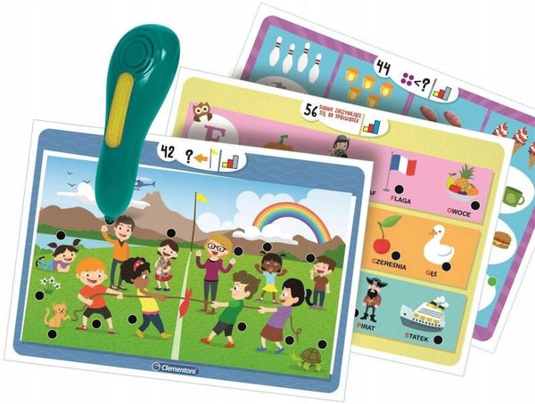 Zestaw edukacyjny zawierający 32 karty i 64 ćwiczenia, które pozwalają dzieciom poznawać litery, słowa, liczby, wielkości, kształty i kolory. Dzięki ponad 1000 quizom dzieci mogą sprawdzić swoją wiedzę samodzielnie lub w grze planszowej dla 2–4 graczy, ucząc się w sposób interaktywny i angażujący. Mówiące pióro prowadzi dziecko przez zadania i potwierdza poprawność odpowiedzi.