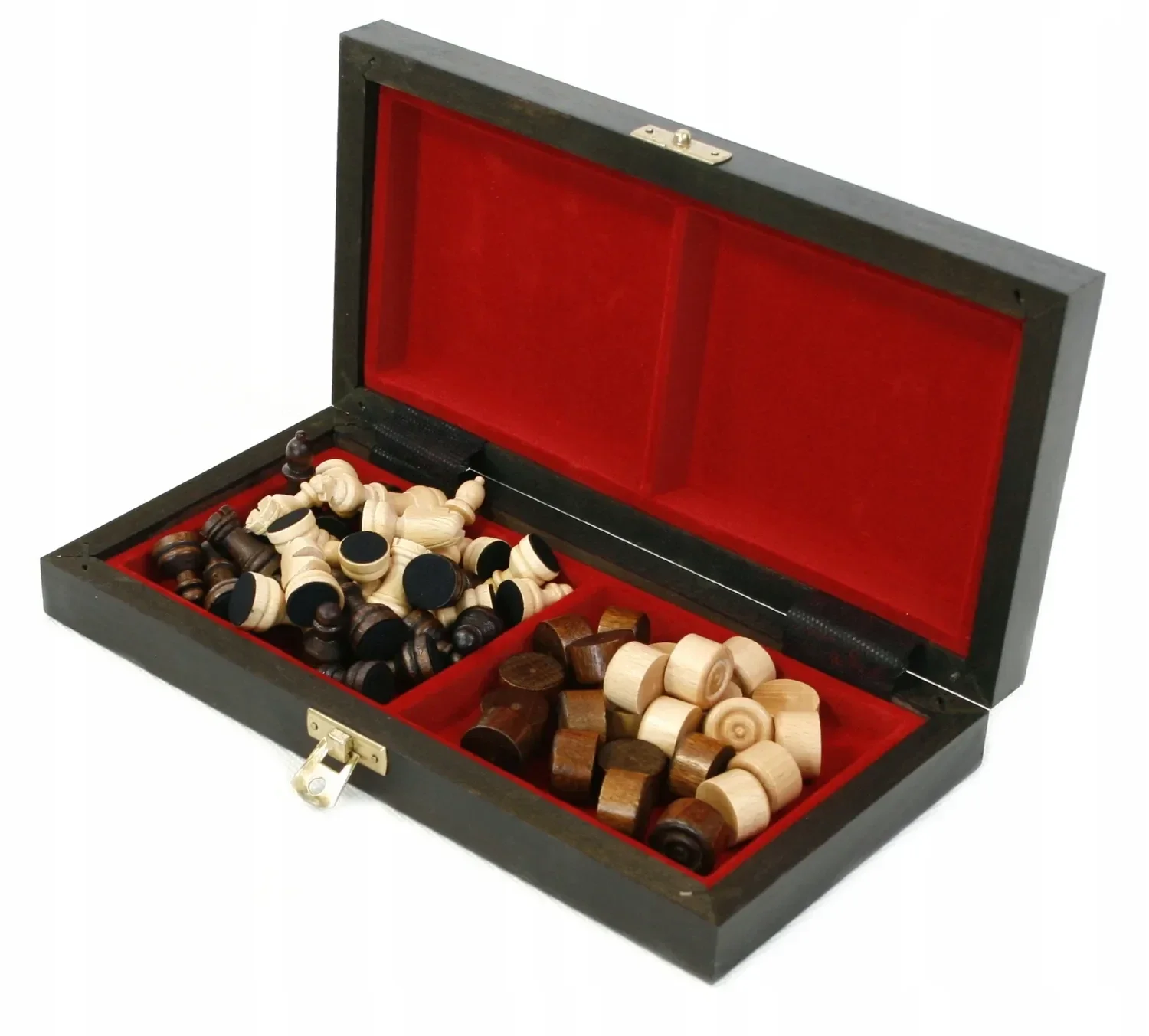 Kompletny, klasyczny zestaw do gry w szachy oraz warcaby, przeznaczony dla wszystkich miłośników logicznych rozgrywek. Eleganckie wykonanie z naturalnego drewna sprawia, że zestaw doskonale sprawdzi się zarówno do gry, jak i jako stylowy element domowej kolekcji.