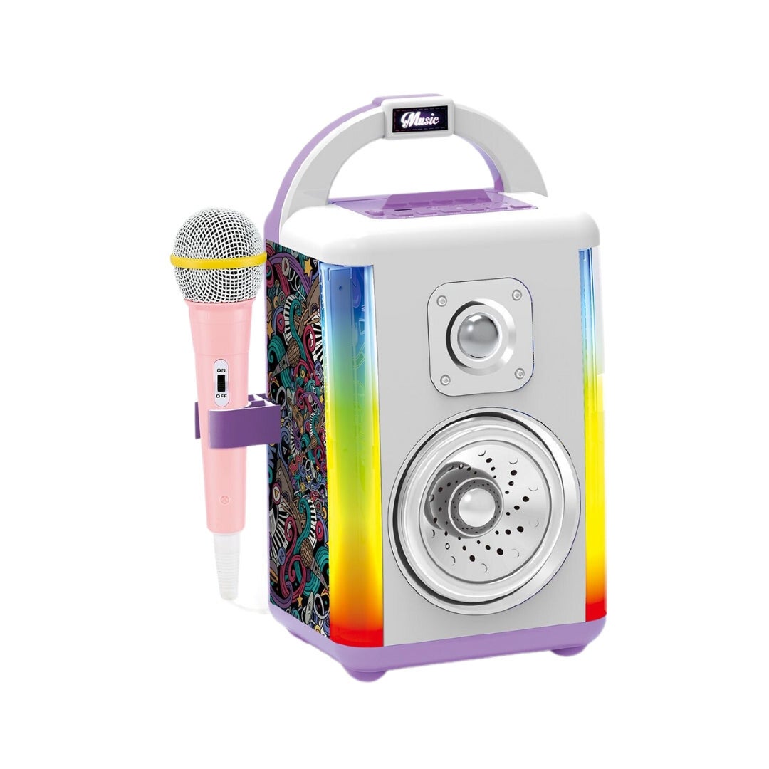Muzyczny zestaw Sound Box z mikrofonem to wyjątkowa propozycja dla dzieci marzących o własnej scenie muzycznej. Zabawka łączy funkcje muzyczne z efektami świetlnymi LED oraz łącznością Bluetooth, tworząc idealne warunki do śpiewania, zabawy i wyrażania kreatywności.