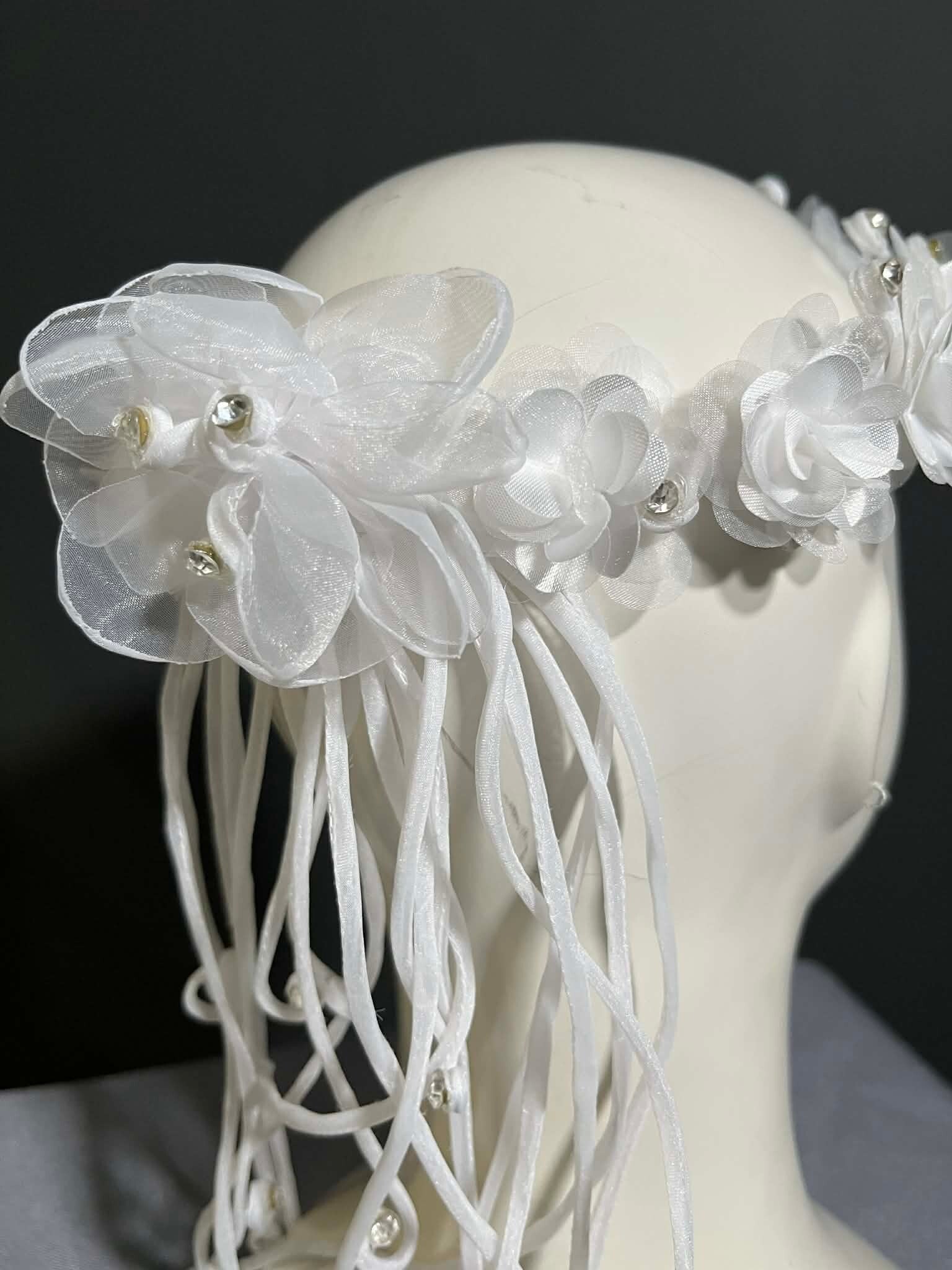 Elegancki Wianek Komunijny z Kryształkami i Satynowymi Wstążkami