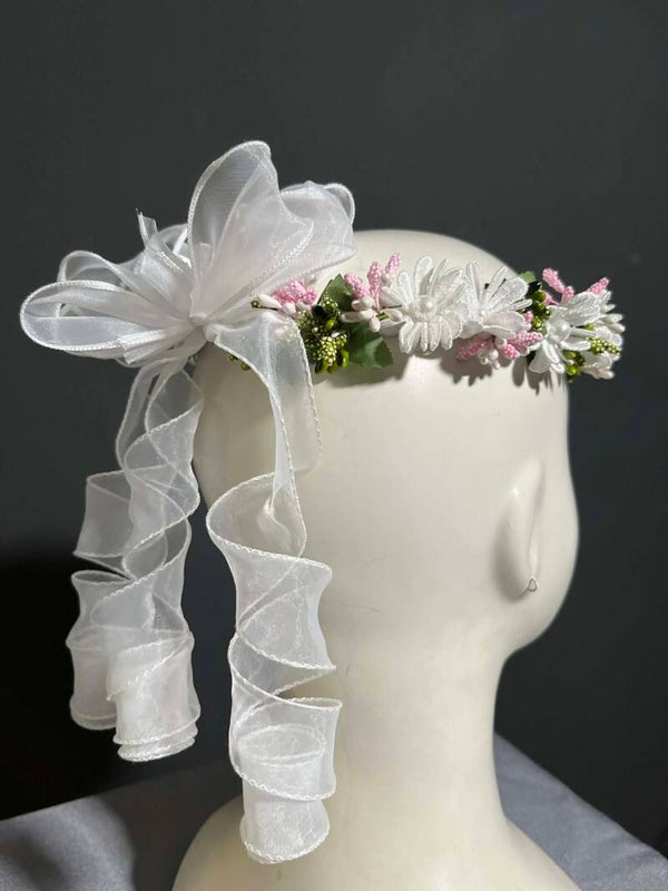 Przód wianka zdobi bogata kompozycja puszystych kwiatów wykonanych z delikatnej, białej tkaniny.
