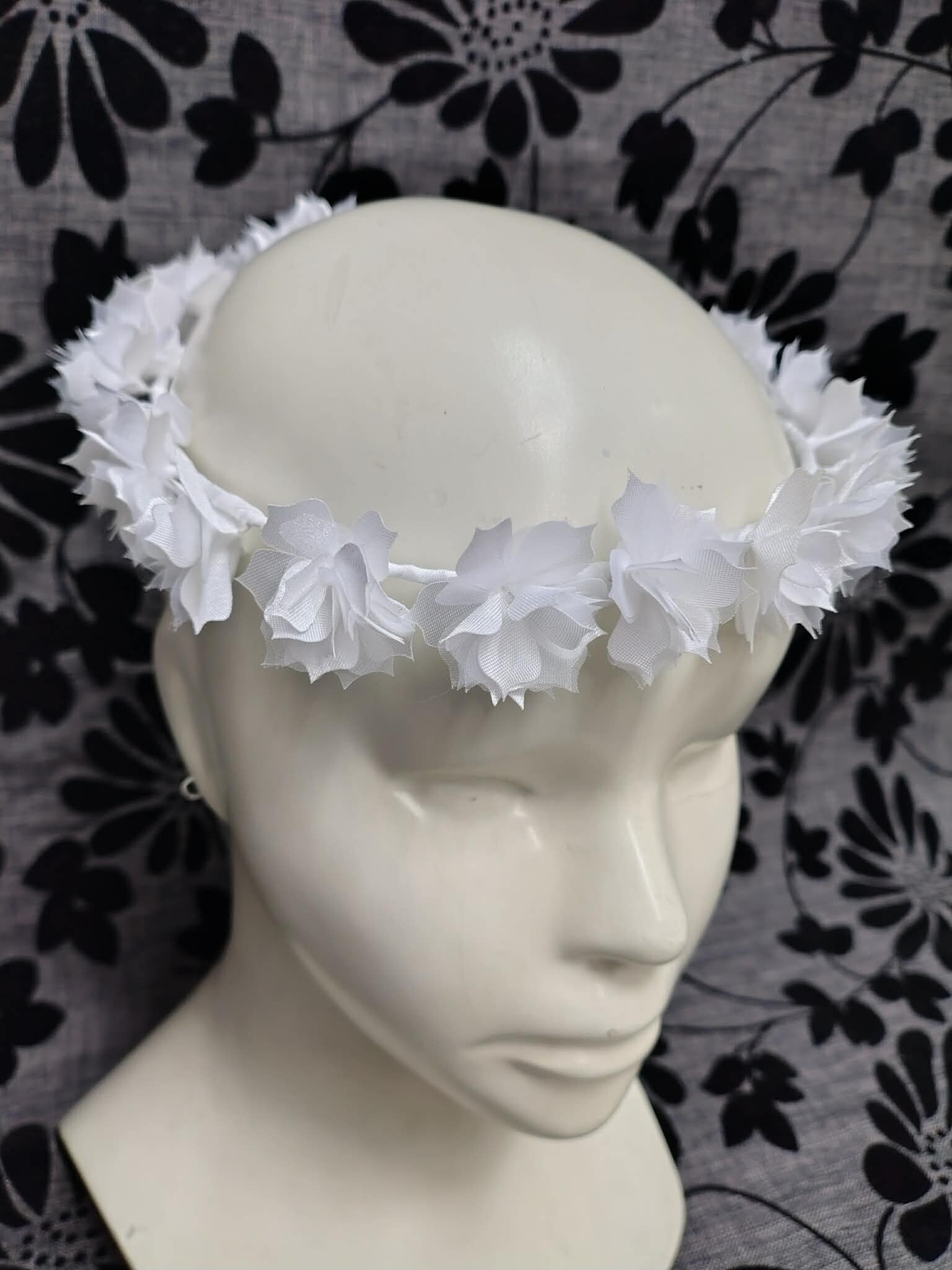 Wianek zdobią gęsto ułożone, puszyste kwiaty wykonane z połączenia delikatnej organzy i lśniącej satyny.