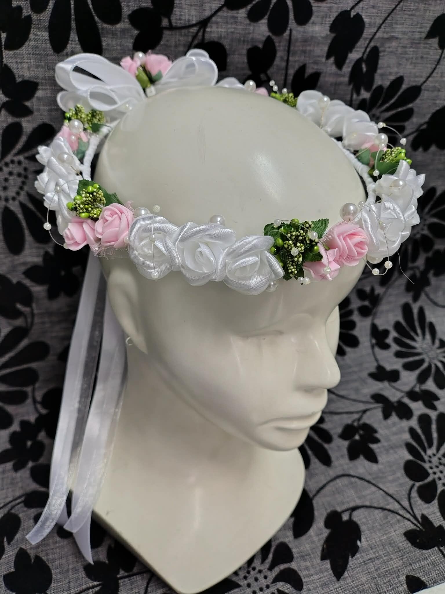 Ten wyjątkowy wianek to połączenie klasycznej bieli z luksusowym wykończeniem. Został zaprojektowany tak, aby zachwycać z każdej perspektywy – od bogato zdobionego frontu, po efektowną kaskadę wstążek z tyłu. To idealny wybór dla dziewczynek, które chcą podkreślić odświętny charakter Pierwszej Komunii Świętej nutą blasku w stylu glamour.