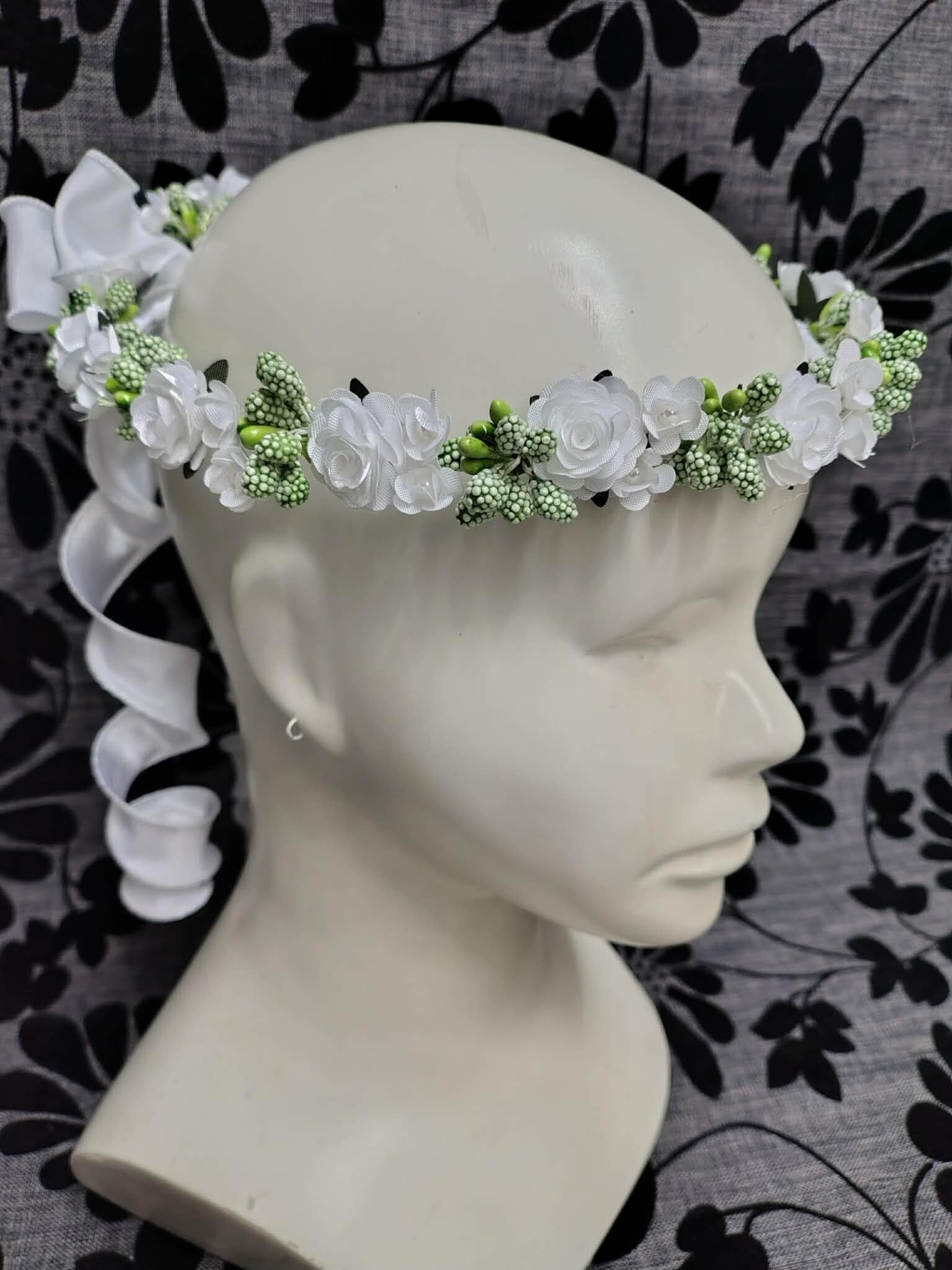 Ten wyjątkowy wianek to kwintesencja komunijnej elegancji, stworzona dla dziewczynek, które w tym wyjątkowym dniu pragną wyglądać i czuć się wyjątkowo. Łączy w sobie nieskazitelną biel satynowych kwiatów z luksusowym blaskiem kryształów, tworząc ozdobę, która zachwyca z każdej perspektywy.