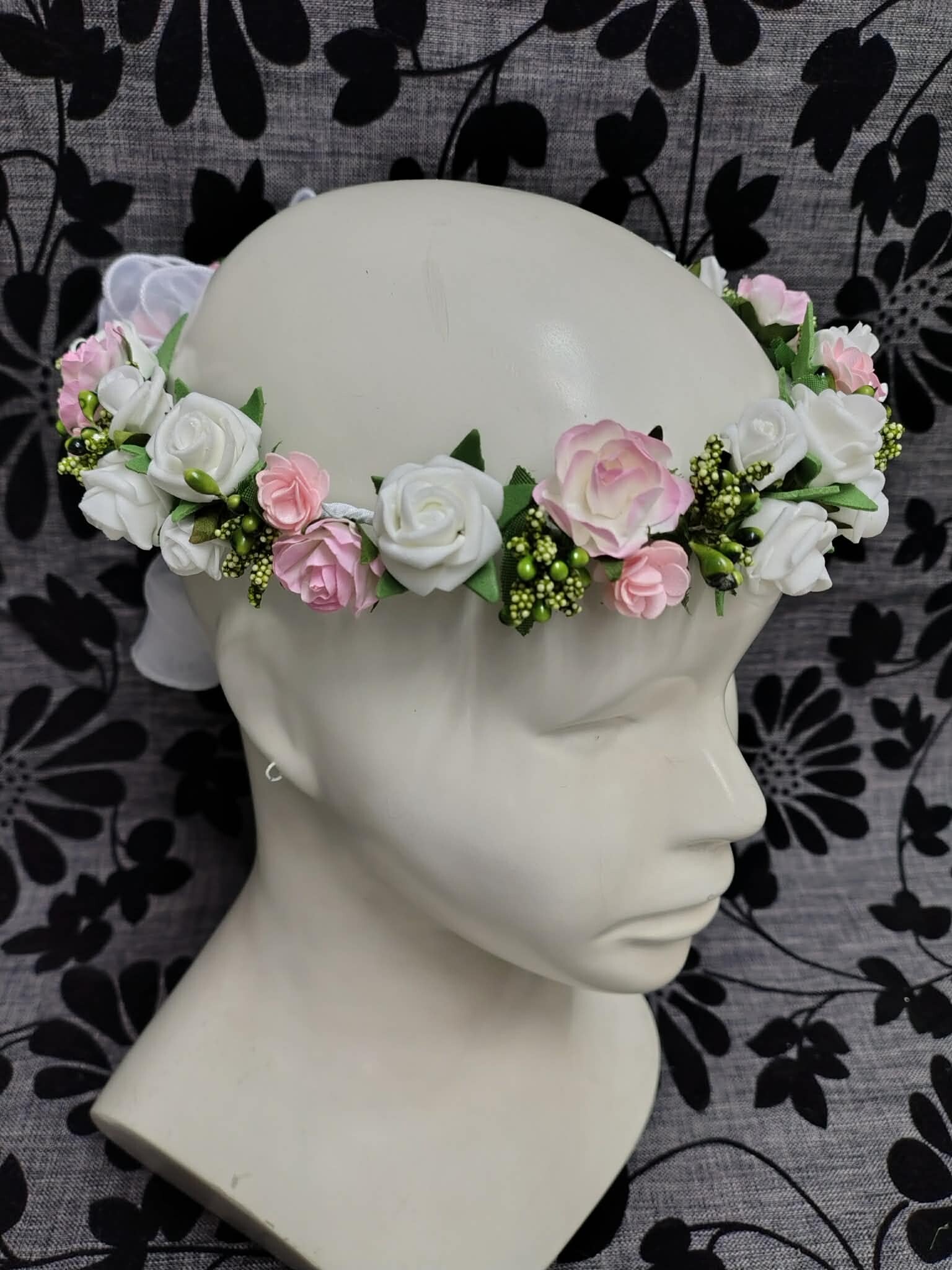 Wianek zdobią puszyste kwiaty wykonane z wysokiej jakości satyny i delikatnej organzy.